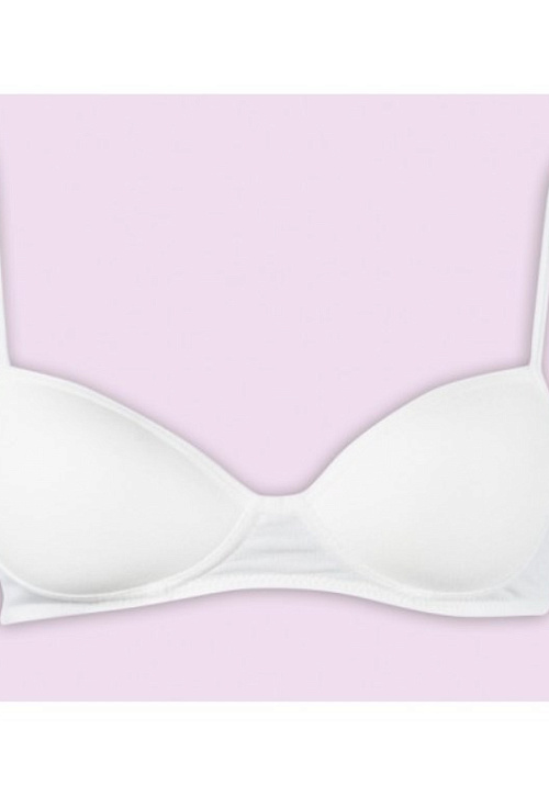Детский бюстгальтер для девочки с чашечками на мягкой формирующей прокладке, вшитые регулирующихся бретельки, застегивается сзади на два крючка.