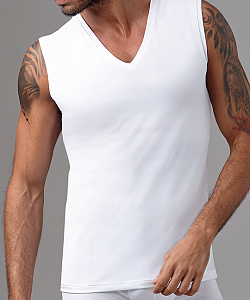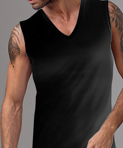 Однотонная мужская майка прямого кроя с V-образным вырезом горловины.
