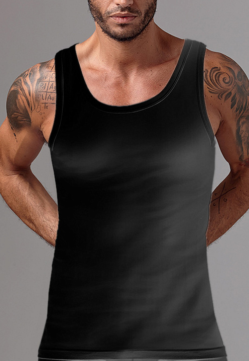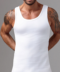 Классическая однотонная мужская майка из ребристого натурального материала, на узких бретелях.