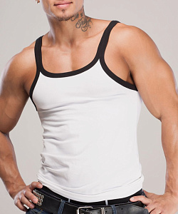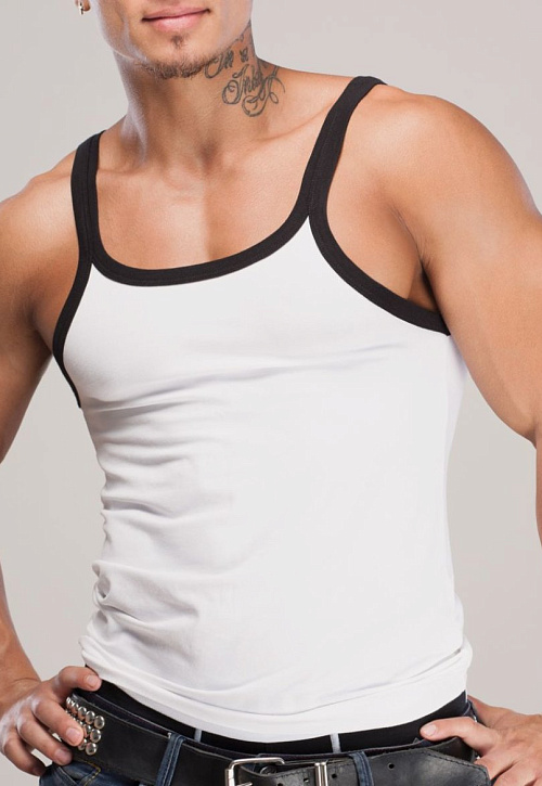 Модная, приятная к телу мужская майка из модала и хлопка в белом цвете с черной окантовкой. На спине вышивка «Opium» и контрастный шеврон «Sport». Можно носить с джинсами или шортами в повседневной жизни, а так же на занятия спортом.