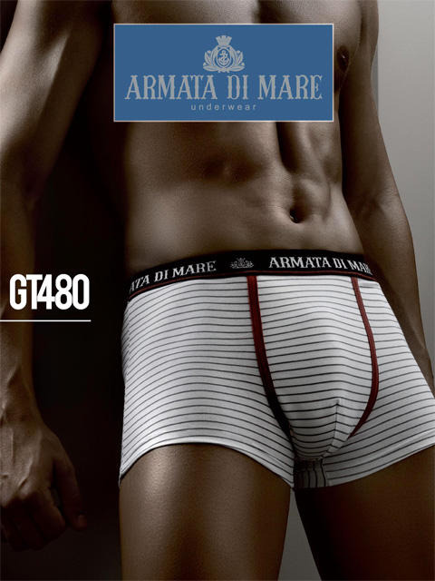 Мужские трусы-боксеры из хлопка с эластаном, на поясе широкая резинка с круговой надписью "Armata di Mare", ширинка выделена яркой тесьмой, рисунок "тонкие полоски".