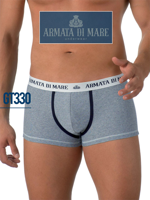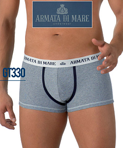 Меланжевые мужские трусы-боксеры из хлопка с эластаном, сзади бесшовные, ширинка выделена контрастной тесьмой, на поясе резинка с надписью "Armata di Mare" по кругу.