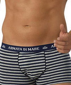 Мужские трусы-боксеры из хлопка с эластаном, украшенные контрастным рисунком "морская полоска", сзади бесшовные, ширинка выделена тесьмой в цвет резинки с надписью "Armata di Mare" по кругу.