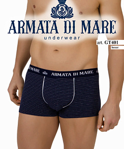 Мужские трусы-боксеры из хлопка с эластаном, на поясе широкая резинка с круговой надписью "Armata di Mare", ширинка выделена контрастной тесьмой, рисунок "тонкие полоски".