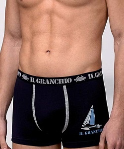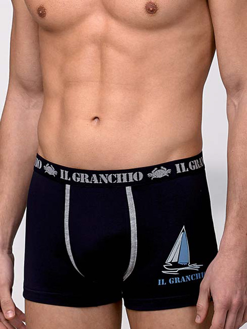 Мужские трусы-боксеры из хлопка с эластаном, на поясе широкая резинка с круговой надписью "Il Granchio", ширинка выделена контрастной тесьмой, сбоку рисунок "парусное судно".