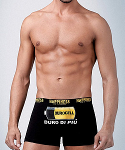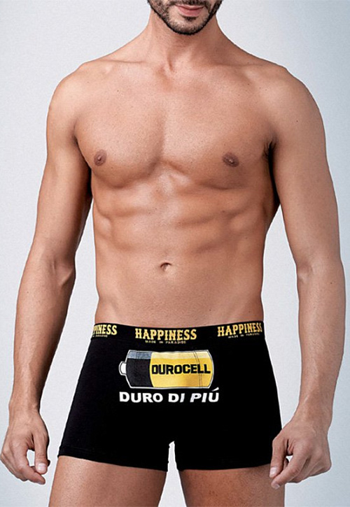 Мужские трусы-боксеры из хлопка с эластаном, на поясе широкая резинка с круговой надписью "Happiness", спереди крупный цветной принт "батарейка".
