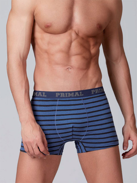 Мужские трусы-боксеры из хлопка с эластаном, на поясе широкая резинка с круговой надписью "Primal", ширинка выделена декоративной прострочкой, принт "горизонтальные полоски".