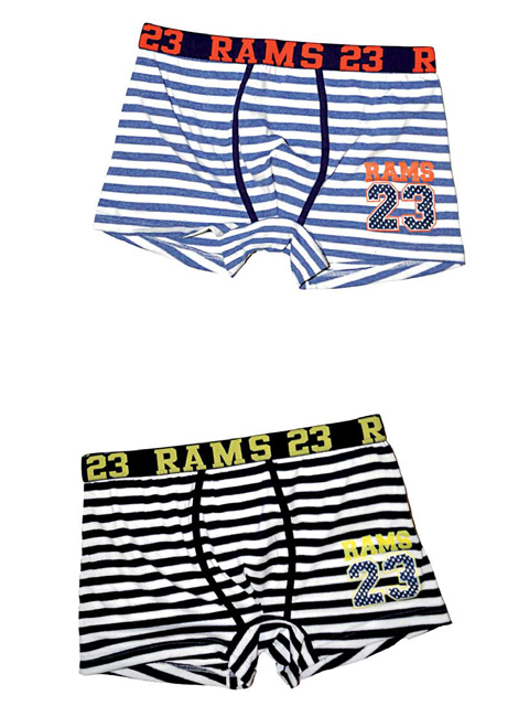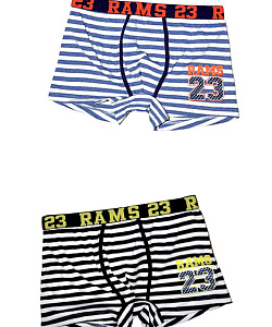 Детские трусы-боксеры из эластичного хлопка, на поясе широкая резинка с круговой надписью "Rams 23", спереди логотип бренда, рисунок "полоски".