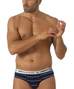Мужские трусы-слип из хлопка с эластаном, украшенные контрастным рисунком "морская полоска", пояс на резинке с надписью "Armata di Mare" по кругу, сзади бесшовные.