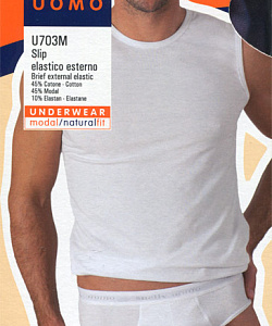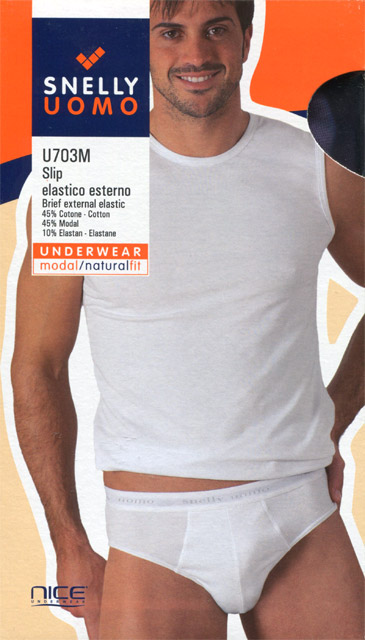 Мужские трусы-слип из хлопка с модалом, на поясе широкая резинка с круговой надписью "Snelly Uomo", задняя часть бесшовная.