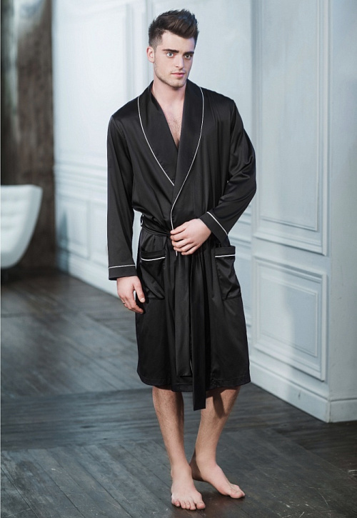 Красивый халат укороченной длиной до колена из тонкой, приятной телу ткани черного цвета. Небольшие манжеты рукавов, а также отложной воротник и части карманов декорированы узким кантом светлого цвета. Халат украшен на спине эффектной вышивкой из мелких страз в виде короны с надписью «Оставайся спокоен». Удобные накладные карманы добавляют модели практичности. Длинный, съемный пояс подчеркивает силуэт. Халат понравится мужчинам, предпочитающим классический стиль, но стремящимся подчеркнуть свою индивидуальность.