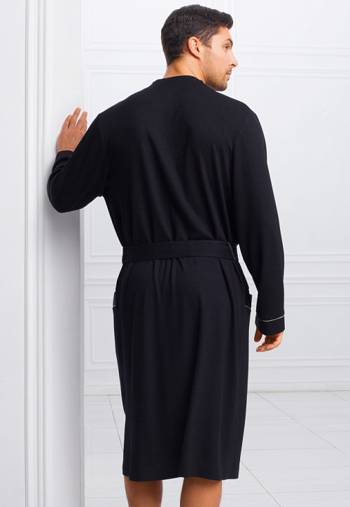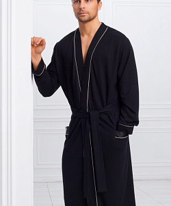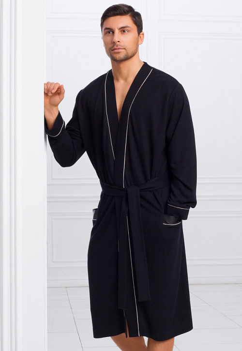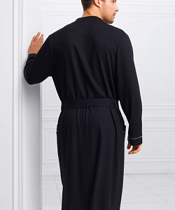 Классический мужской халат средней длины из легкой, натуральной ткани черного цвета. В составе ткани бамбук, придающий ей особую мягкость и долговечность. Края полочек, манжеты халата, а также карманы декорированы тонким атласным кантом контрастного цвета. Клапаны карманов, а также сторона пояса выполнены из атласной ткани в тон. Халат украшен на левой груди элегантным шевроном-вышивкой. Удобные, глубокие карманы добавляют модели практичности. Длинный, съемный пояс подчеркивает силуэт. Классическая модель укороченной длины подойдет мужчинам, ценящим комфорт.