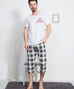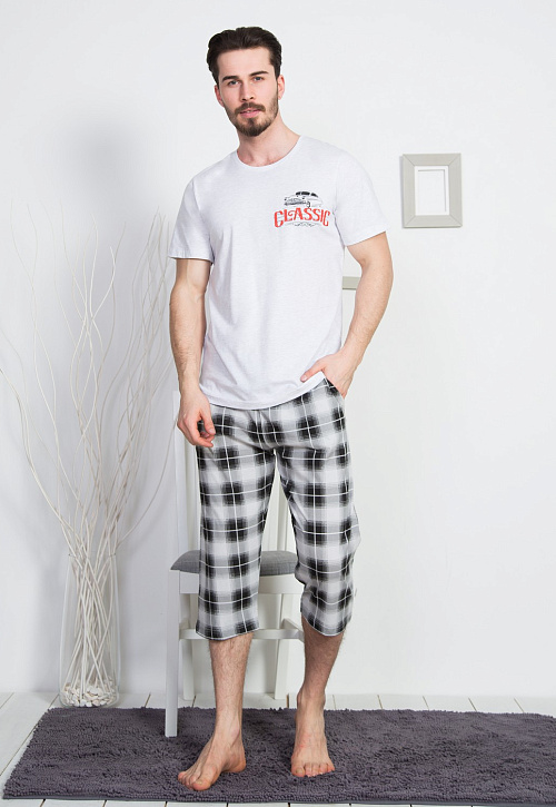 Домашний мужской комплект прямого свободного кроя из турецкого хлопка в светло-сером и темно-синем цветах. Футболка с короткими рукавами и классической круглой горловиной, декорирована термоаппликация в левой части груди. Брюки-капри в клетку тартан с карманами на резинке и регулируемой завязке. Качественная турецкая ткань, из которой сшит комплект, – дышащая, легкая, износостойкая и маломнущаяся. Не отжимать, не сдавать в химчистку, стирать при 30 градусах, гладить до 110 градусов, не отбеливать. Произведено в Турции.