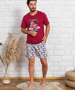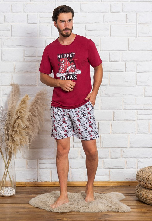 Мужской домашний комплект прямого кроя из качественной турецкой ткани (верх: 100% хлопок, низ: 70% хлопок, 30% полиэстер). Однотонный верх с классической круглой горловиной и коротким рукавом украшен термоаппликацией кед на груди. Свободные шорты с карманами держатся на резинке, декорированной завязками, и дополнены узором в виде кед. Ткань дышащая, легкая, износостойкая и маломнущаяся, а также легко стирается.