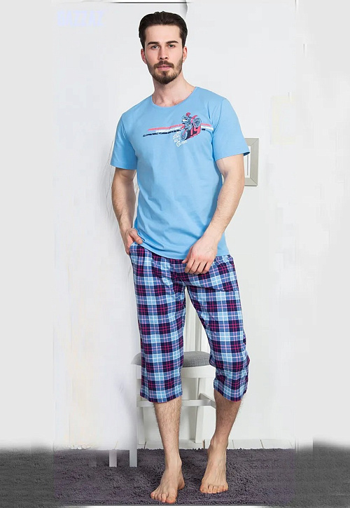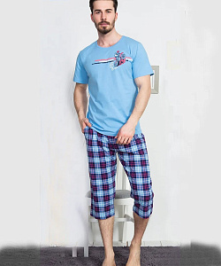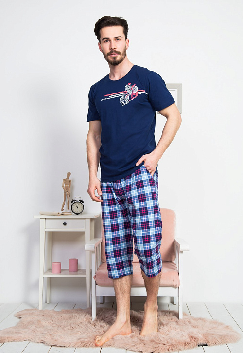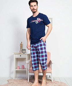 Домашний мужской комплект прямого кроя из чистого хлопка в оливковом и синем цветах. Футболка с короткими рукавами и классической круглой горловиной, декорирована термоаппликация в верхней части груди. Брюки-капри в клетку тартан с карманами на резинке и регулируемой завязке. Качественная турецкая ткань, из которой сшит комплект, – дышащая, легкая, износостойкая и маломнущаяся. Не отжимать, не сдавать в химчистку, стирать при 30 градусах, гладить до 110 градусов, не отбеливать. Произведено в Турции.