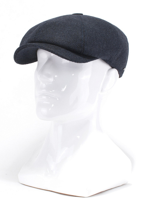 Кепка с удлиненным козырьком выполнена из пальтовой ткани синего цвета. Подкладка из вискозы с тонким синтепоном. Внутри кепки имеются шнурок-утяжка для регулировки размера и ушки для холодной погоды.