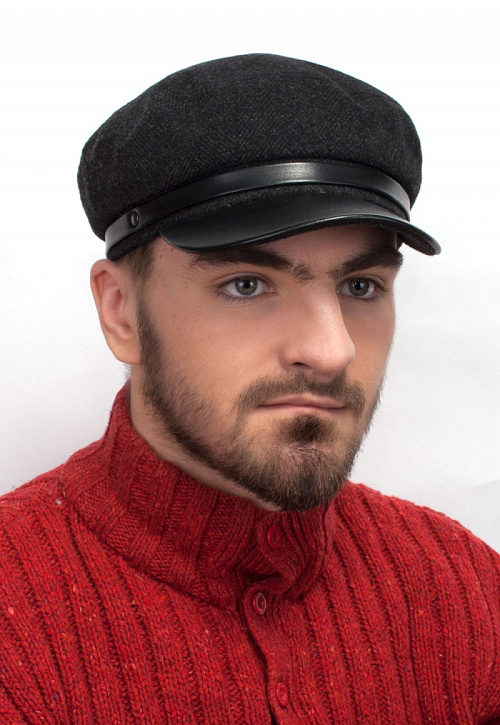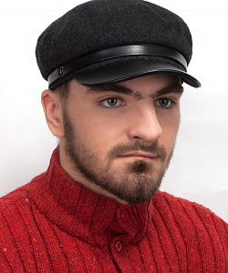 Кепка выполнена из пальтовой ткани темно-серого цвета. Отделка из натуральной кожи черного цвета. Подкладка из вискозы с тонким синтепоном. На затылке кепки имеется оригинальный замок-утяжка.
