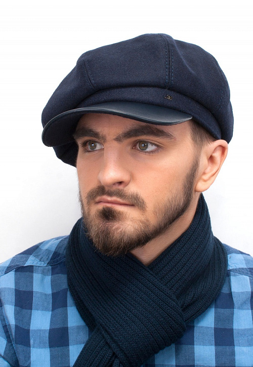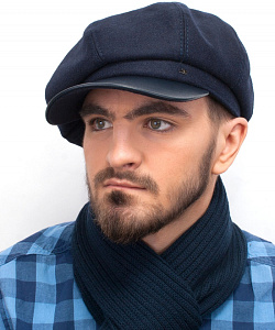 Кепка большого объема из шерстяной ткани итальянского производства с утеплителем. Козырек из натуральной кожи. Подкладка из мягкой и нежной, не электризующей волосы вискозы. Внутри кепки имеется шнурок-утяжка для регулировки размера. Пластичность изделия позволяет обладателю этого модного аксессуара легко формировать посадку на голове на свой вкус.
