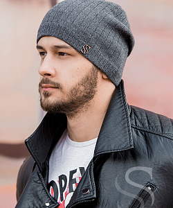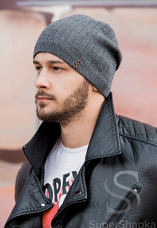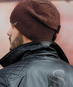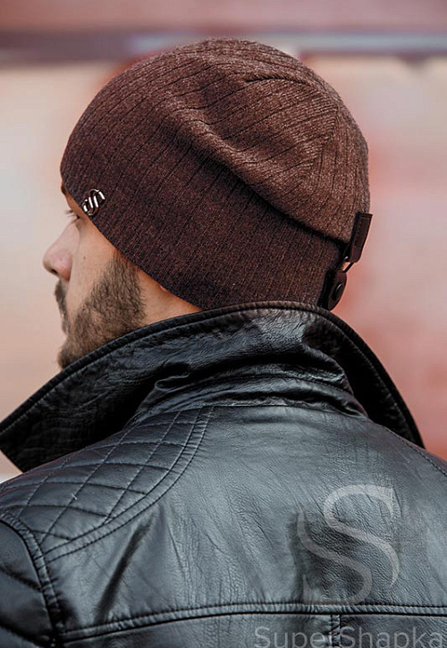 Мужская удлиненная шапка гладкой вязки с узкой рельефной манжетой. Модель фиксируется сзади ремешком-застежкой.
