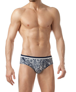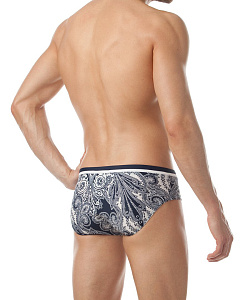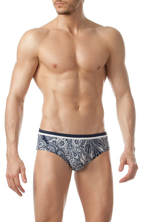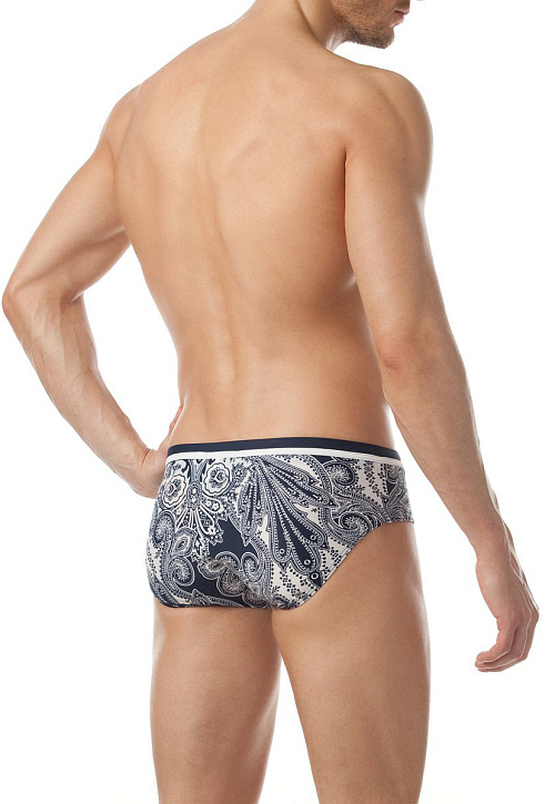 Стильные мужские плавки классической посадки со средним бочком, контрастным отрезным поясом с белым кантом и потайным шнуром для регулировки посадки на теле. Элегантный принт 'Пейсли' в сдержанных сине-белых тонах подчёркивает мужественность модели.