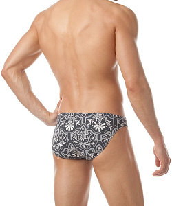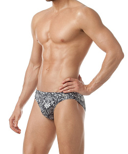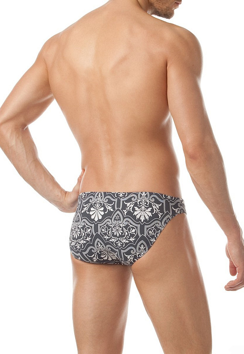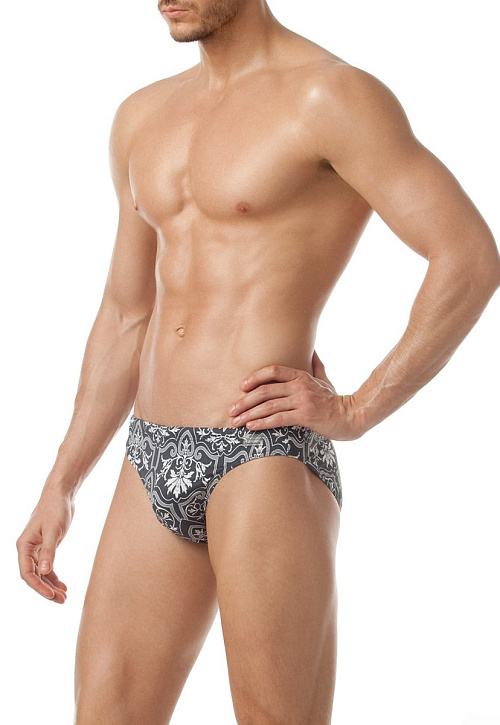 Модные мужские плавки классической посадки c узким бочком, поясом 'запакованного' типа и потайным шнуром для регулировки объёма. Стильный графичный принт в стальных тонах выполнен на деликатной микрофибре.