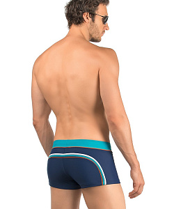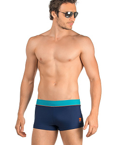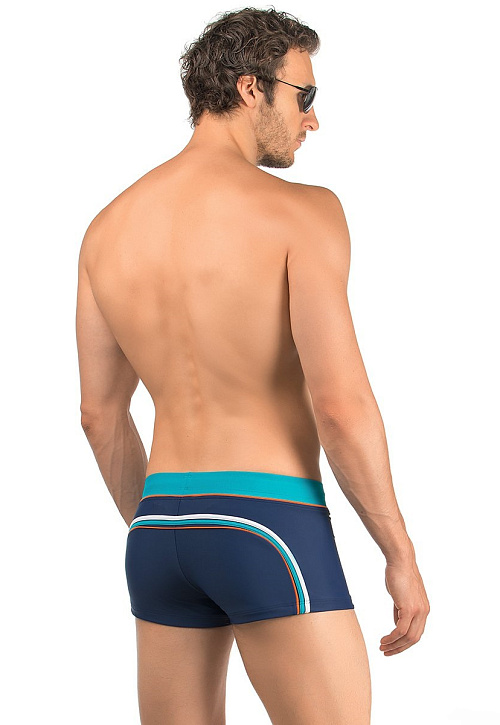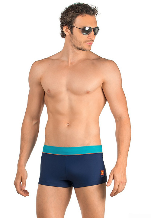 Модные мужские плавки-шорты с удобным шнурком потайного типа – для регулировки посадки на теле. Элегантный темно-синий цвет, контрастный бирюзовый пояс и яркие нашивки.