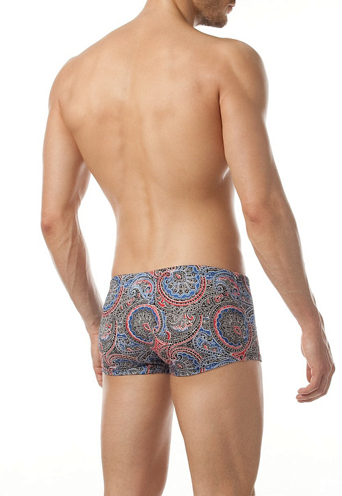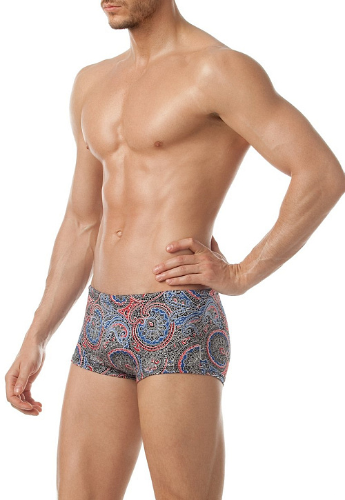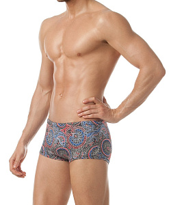 Стильные мужские плавки-боксеры классического кроя с поясом 'запакованного' типа и потайным шнуром для дополнительной фиксации на теле. Модный восточный орнамент в сочетании с оттенком 'Синий джинс' идеально подчёркивает чистоту линий модели.