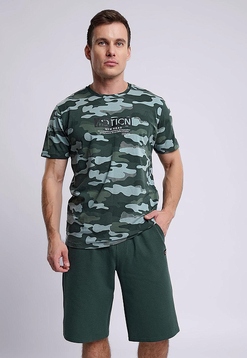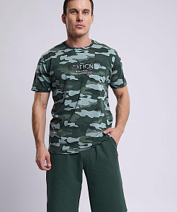 Стильная мужская футболка из хлопкового полотна с эластаном в камуфляжный рисунок. Оригинальность изделию придает авторский принт и фирменная вшивка. Отличный вариант для прогулок и встреч с друзьями.