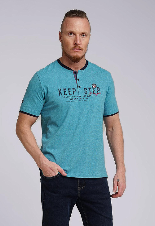 Футболка с планкой, контрастной отделкой по горловине, манжету и разрезам. Данную модель дополняет принт и шеврон. Прекрасное решение для встречи с друзьями или похода на работу. Составит комплект с брюками или джинсами.