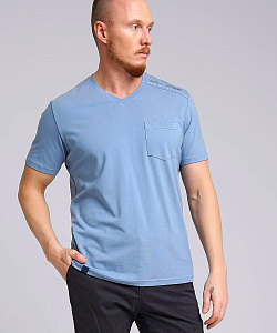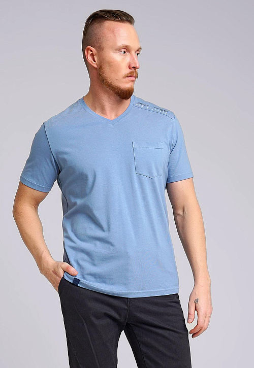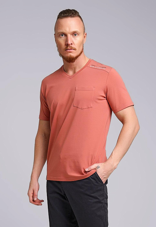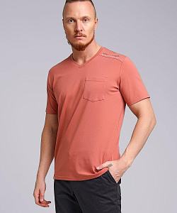 Мужская футболка из дышащего полотна с большим содержанием хлопка и минимальным добавлением эластана.С V-образной горловиной и коротким рукавом.Модель дополняет нагрудный карман,текстовой принт и имиджевая фурнитура.Расширенный размерный ряд .