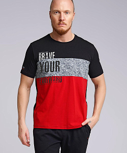 Футболка комбинированная с вставкой на полочке и оригинальным принтом. С коротким рукавом и круглой горловиной. Дополнена имиджевой фурнитурой. Отличный вариант для встреч с друзьями .
