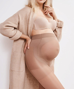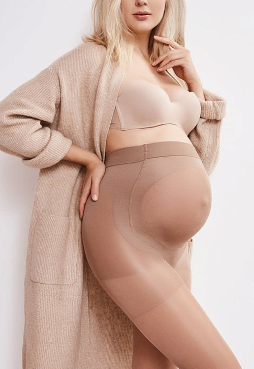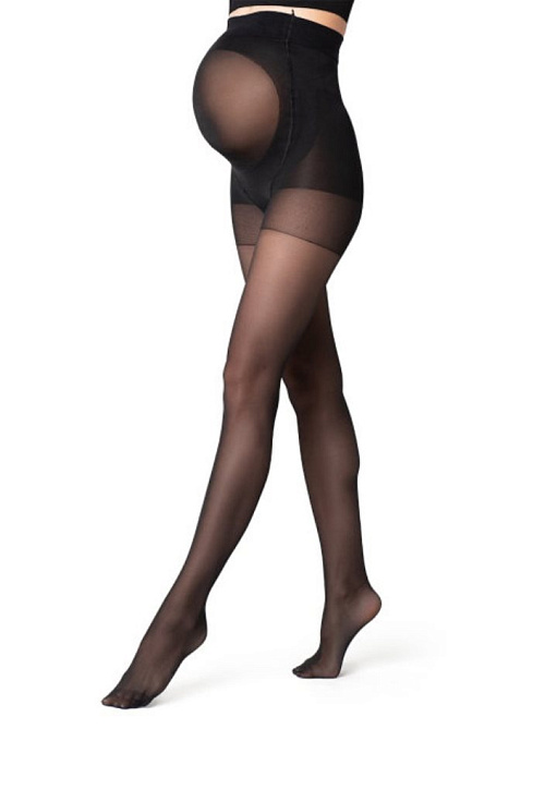 Средней плотности прозрачные колготки для будущих мам (для беременных), верхняя часть специальных шортиков со эластичной вставкой спереди и эффектом бандажа для поддержки живота. Специальный широкий анатомический пояс-резинка не оказывает давление на живот. Легкий поддерживающий эффект по ноге, с гигиенической ластовицей из хлопка, не формованные, уплотненный мысок.