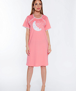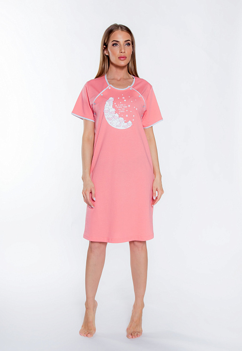 Туника прямого кроя с круглой горловиной, удлиненным рукавом, термоаппликацией в виде полумесяца на груди, окантовкой бейкой и удобными застежками для кормящих мам. Подол ниспадает до колен.