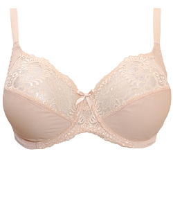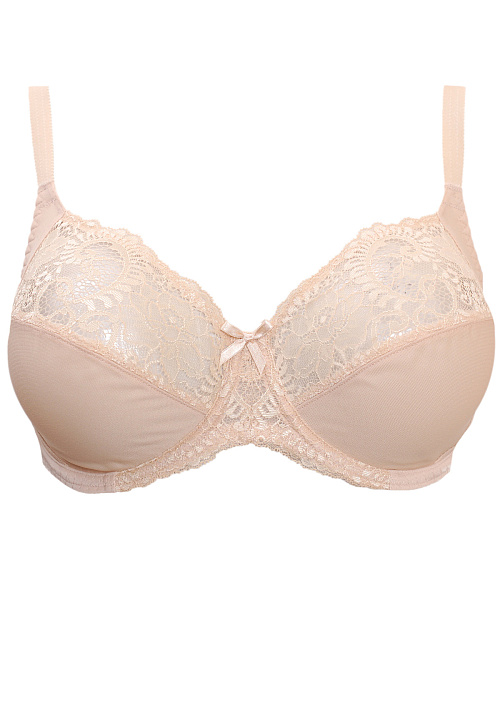 Бюстгальтер из неэластичного и эластичного трикотажного полотна и эластичного кружева. На каркасах. Мягкие чашки с двойным членением и боковой корректирующей деталью. Отделка – бантик.