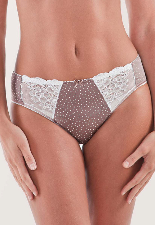 Классические трусы из эластичного полотна с рисунком, с кружевными вставками на передней части изделия и маленьким декоративным атласным бантиком.