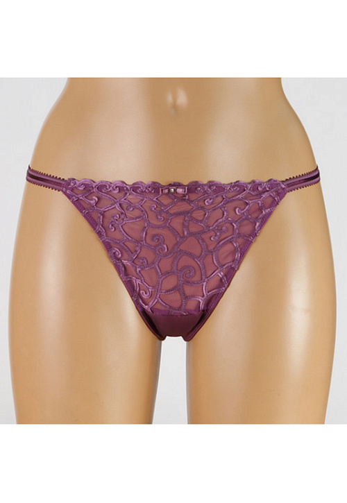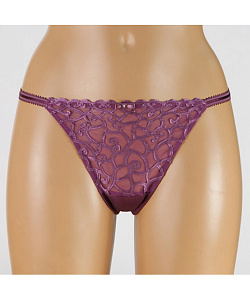 Трусики-танга сшиты из эластичного гладкого полотна. Передняя деталь выполнена из сетчатой ткани и украшена вышивкой. Вышитая аппликация обработана лазером. По линии талии проходит эластичная тесьма, которая одновременно служит боковыми деталями.