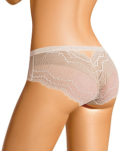 Шорты комфортной посадки из хлопкового полотна с эластаном и эластичного кружева по спинке, переходящего на деталь переда. По талии выполнена обработка жаккардовой резинкой, завершает дизайн фигурный вырез на спинке по центру.