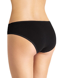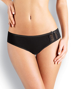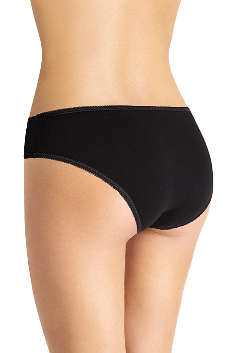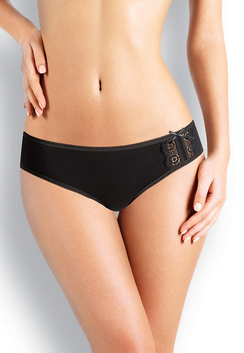 Бикини удобной посадки с кружевными вставками и декоративным атласным бантом слева на детали переда. Деталь спинки выполнена из однотонного хлопкового полотна. По поясу и ножкам обработаны резинкой с фестоном.