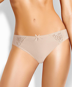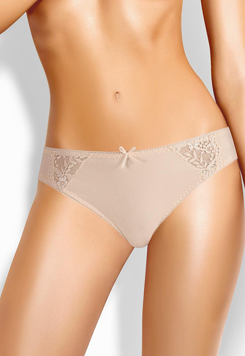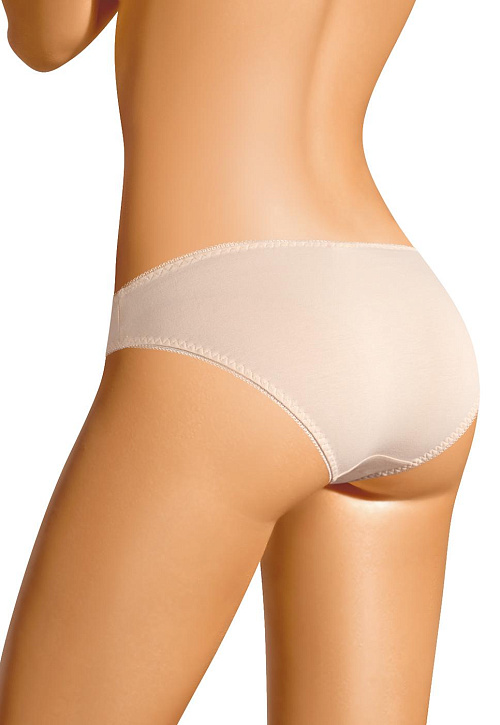 Бикини из однотонного полотна, удобной посадки. Спереди украшены симметричными кружевными вставками. По ножкам и поясу обработан резинкой с фестоном. Спереди по центру модель украшена небольшим бантом.