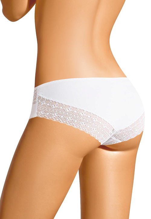 Трусы бикини комфортной посадки из хлопкового полотна с добавлением эластана. На детали переда по талии широкое кружево на полотно. На детали спинки по талии резинка с фестоном, по ножке кружево.