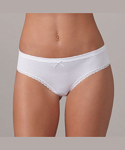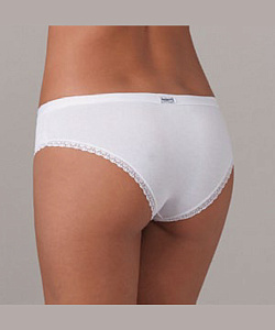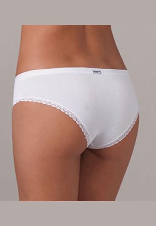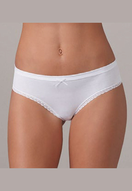 Удобные трусики-брифы из гладкого эластичного хлопкового полотна, со средней посадкой. Срезы проймы отделаны тонкой кружевной тесьмой. Верхний срез плоскошовный, выполнен из двухслойной основной ткани методом всгиб.