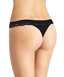 Трусы стринги комфортной посадки. В отрезном бочке -кружево, переходящее на спинку. По поясу и ножкам-обработка резинкой с фестоном. На детали переда расположен небольшой атласный бант.