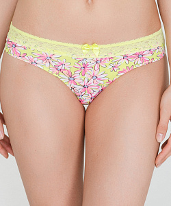 Трусики-стринг из эластичной хлопковой ткани с ярким цветочным принтом. Линия талии декорирована узким кружевом.Передняя деталь декорирована бантиком. .