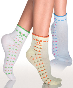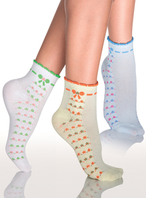 Носки Vis-A-Vis CL 12-07. Модель изготовлена из мягкого хлопка, мягкая резиночка не будет сдавливать кожу. На модели цветочный орнамент и имитация бантика с лентой по верхнему краю.