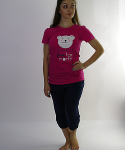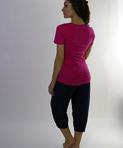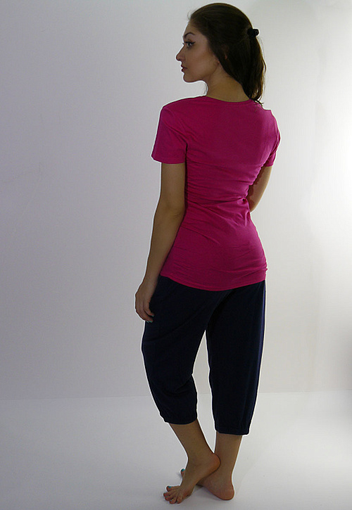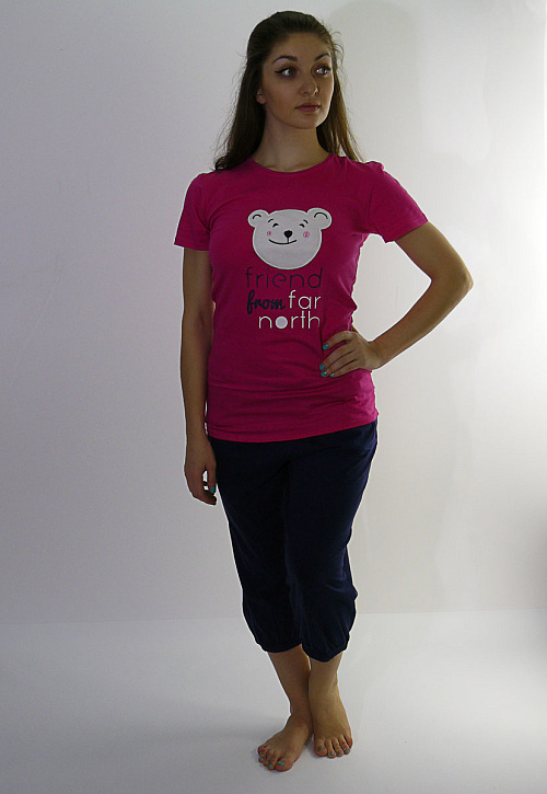 Женские пижамные бриджи изготовлены из желтой хлопковой ткани-основы с добавлением эластана, эта добавка значительно повышает эластичность изделия. Имеет розовые широкие ленты-завязки, по бокам расположены два удобных кармана. А с задней части бридж выполнена аппликация в виде медведей.