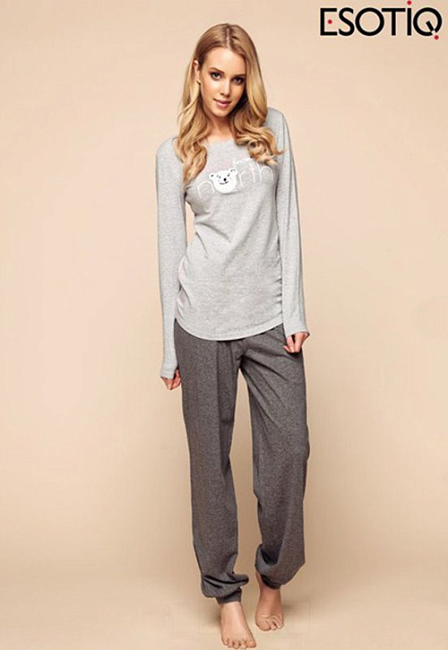 Женские пижамные брюки выполнены из высококачественного темного хлопкового материала, с малым добавлением эластана, на поясе выполнена контрастная широкая завязка, к бокам изделия пришиты карманы, сзади выполнено украшение – изображение белого мишки. Низ изделия имеет эластичную ленту, и внешне штаны выполнены в восточном стиле.