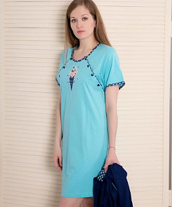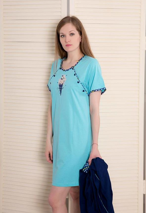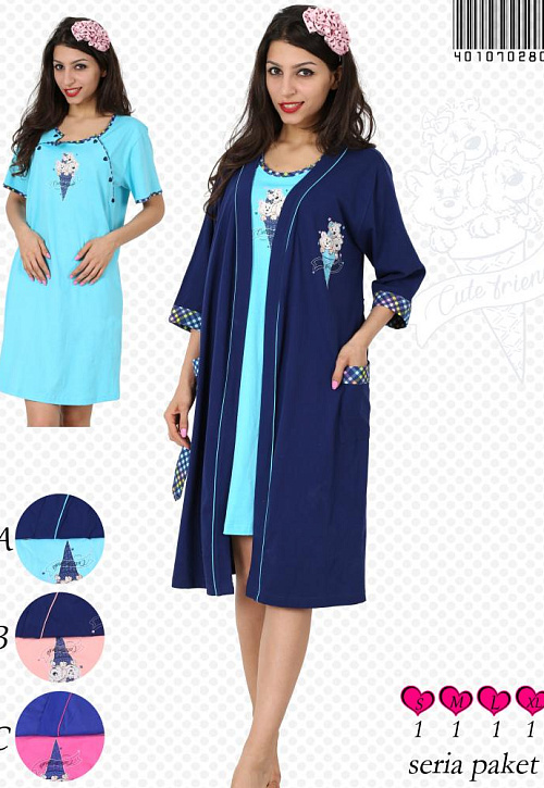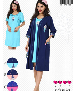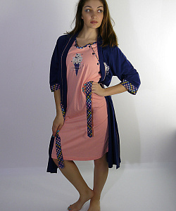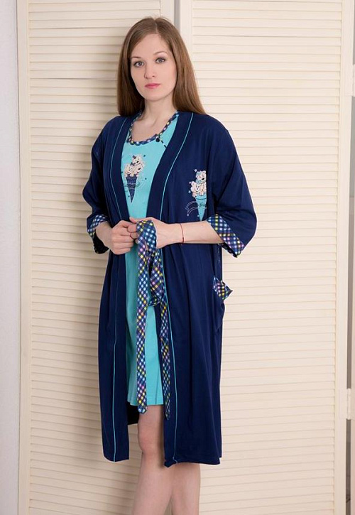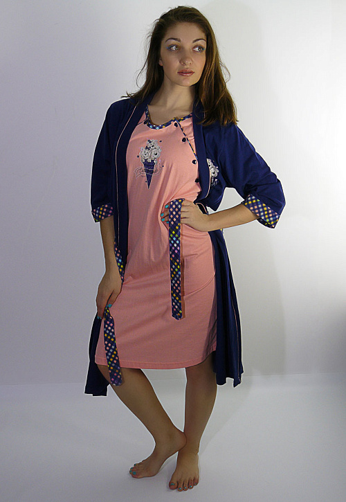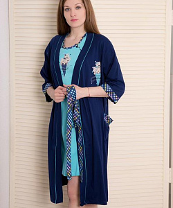 Комплект женский двойка. Туника с коротким рукавом, свободной формы, оформлена пуговицами, вырез горловины круглый. Халат рукав 3/4, на запах под пояс, с карманом.