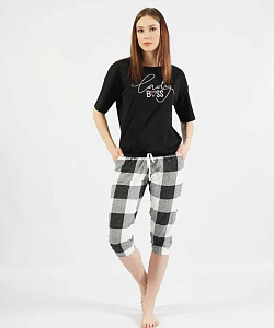 Состав изделия домашней одежды для женщины и муж. Комплект ( бриджи + футболка )