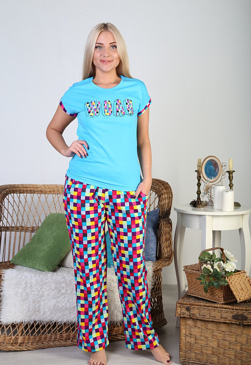 Состав изделия домашней одежды для женщины и муж. Комплект ( брюки + футболка )