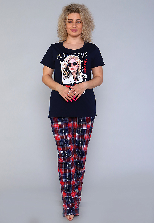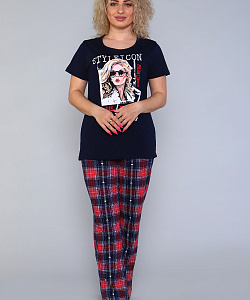 Комплект из хлопковой трикотажной кулирки. Футболка с коротким втачным рукавом, на полочке яркий принт. Брюки в клетку с боковыми карманами.